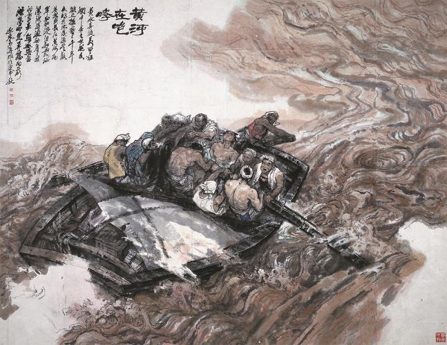 杨力舟、王迎春 黄河三联画之一《黄河在咆哮》220x290, 1973、1980, 纸本设色 ..