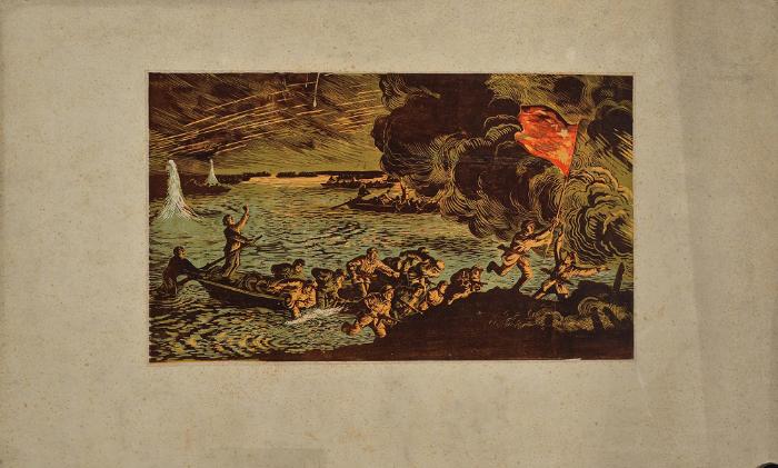 古元,《渡江》,画心:23x29cm,外边-46.3x66.3cm,1950,木版套色,中央美..