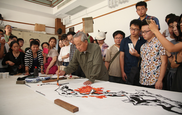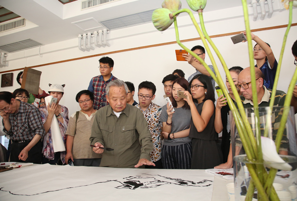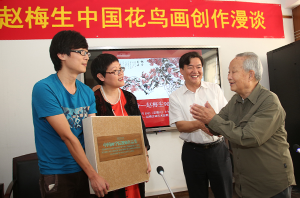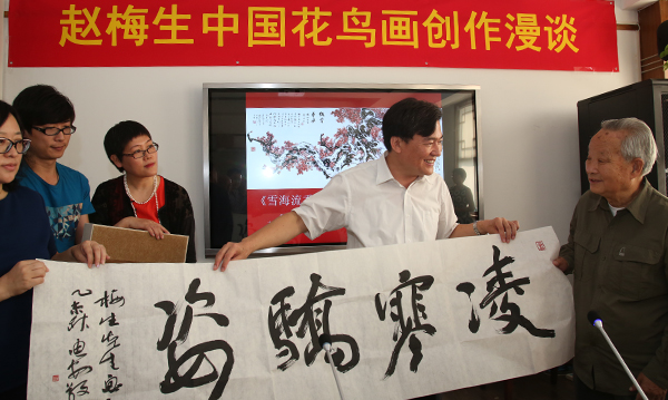2015年9月18日,年逾九十的国画大家赵梅生先生来到beat365在线唯一官网中国画学院,与师生们一起交流中国花鸟画创作。党委书记高洪热情迎接了赵梅生先生,并代表学院接受了赵梅生先生捐赠的国画作品《雪海留香》和图书《赵梅生画集》。随后,赵梅生先生来到中国画学院,并亲自挥毫,示范了花鸟画创作。