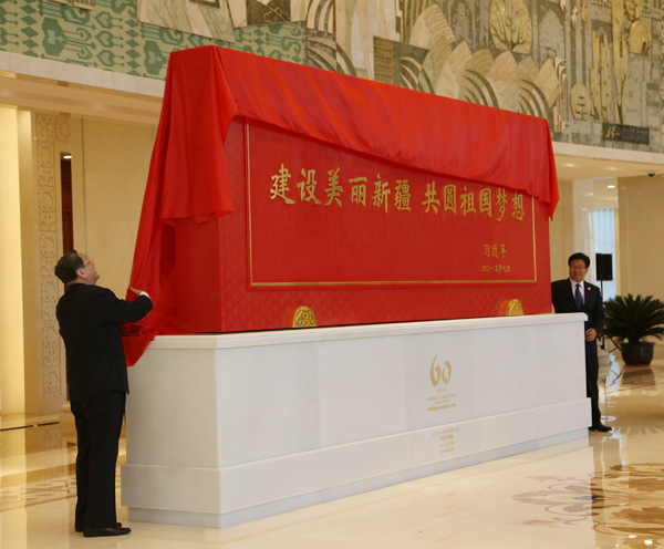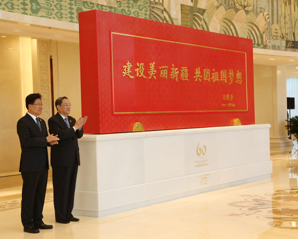 贺匾蔚为大观,高3.1米、宽6米,以鲜艳的中国红为底色,正面是贴金的习近平总书记题词“建设美丽新疆 共圆祖国梦想”,背面是维吾尔、哈萨克、蒙古、柯尔克孜四种少数民族文字对习近平总书记题词的译文。匾额内圈回纹、外圈水纹,回纹寓意连绵不断、吉利永长,象征各民族团结和睦、共同繁荣;水纹代表中华民族的母亲河黄河和新疆人民的母亲河塔里木河源远流长,各族人民生生不息。俞正声和中共中央政治局委员、自治区党委书记张春贤一道,为习近平总书记题词贺匾揭幕。