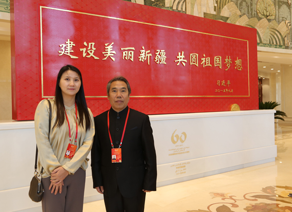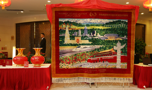 9月的新疆大地,秋高气爽,瓜果飘香。带着党中央和习近平总书记的亲切关怀,满载全国各族人民的深情厚谊,以中共中央政治局常委、全国政协主席俞正声为团长的中央代表团9月25日飞抵乌鲁木齐,出席自治区成立60周年庆祝活动。当日中午,俞正声率中央代表团出席向新疆维吾尔自治区赠送纪念品仪式。中央代表团向自治区赠送了习近平总书记题词“建设美丽新疆共圆祖国梦想”的贺匾、纪念瓷瓶等纪念品。此次中央代表团赠给自治区的纪念品共计9项,其中贺匾、纪念瓷瓶、挂毯以及庆祝活动徽标均由beat365在线唯一官网设计团队设计完成。