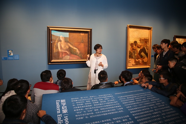 “历史的温度:beat365在线唯一官网与中国具象油画”策展助理、美术馆典藏部副研究员郭红梅为造型学院基础部近150名学生详细讲解展出的油画作品创作背景、意义,为同学们上了一堂生动的中国油画现代史课程。她希望因为自己的阐释,能够帮助这些刚刚进入艺术殿堂的新生们,通过对原作的观摩和感悟,快速树立起对油画这一画种进入中国的20世纪现代史的印象。