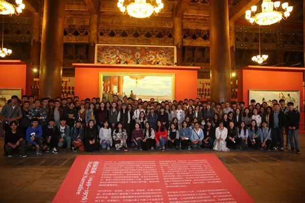 “从晚清民初油画初入中国的传播到新中国成立后油画民族化、出现大量经典作品,从改革开放新一批大师的出现到当代油画家对社会深切的人文关怀。”郭红梅老师系统的讲解,让同学们进入了近代油画发展的历程。“来到梦想中的美术学院,没想到第一节专业课竟然是在这样一个艺术殿堂。在这个特殊的上课地点学习中国文化,了解美院历史,让我了解到为中国造型的意义”,“匆匆太庙之行,却饱览多幅以前如雷贯耳的名作,加上老师充满激情与真诚的讲解,深深地感染了我”,对于大一新生周宏博、李泉颖他们来说,这样的专业课是新鲜的,触摸经典更能留下深刻地印象。200余幅代表中国油画百年历程的经典之作,一百年的油画,这是中国油画的历史,这也是中央美院发展历程的缩影,“这次活动是基础部主任张路江老师策划的,第一堂专业课,让这些刚刚进入美院的孩子认识美院的传承,认识中国油画百年所走过的路程,给学生一种深层次的启发,让他们对自己即将从事的专业有更多的认识。”带队的基础部副主任李荣林谈到了“第一课”的重要性。