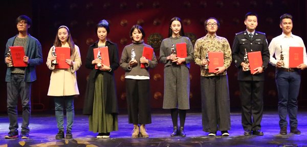 人文学院于跃同学(右起第三)和中国画学院王羽静同学(左起第三)分获优秀男、女演员奖