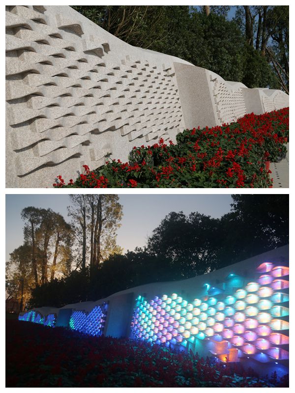 我院建筑学院副院长常志刚教授组建的“媒体建筑和光艺术”创作团队完成了园区“光艺术”领域的相关设计。置于园区入口处的媒体装置在白天呈现出海洋洋流和鱼群流动游弋的动态,夜晚时灯光亮丽,犹如片片滚动的海浪,十分具有生命力。