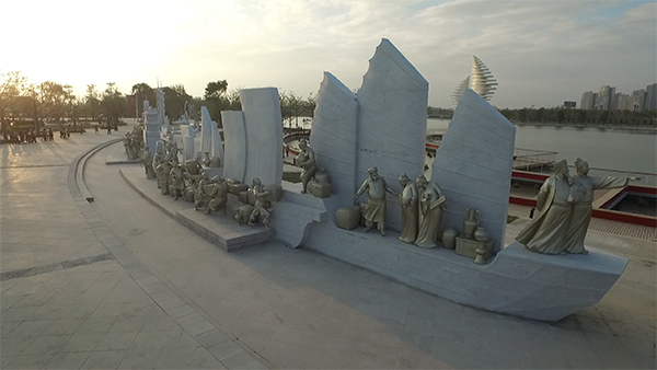 一组长达百米、人物造型近百的群雕“丝路盛景”