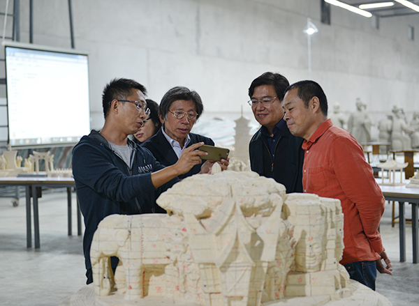 我院雕创所艺术家段海康(右一)、赵国明(左一)向党委书记高洪、院长范迪安汇报创作进展