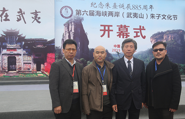 背依籍溪涓涓流水、前瞻缭绕云雾青山,一位身着襕衫的先生手握书卷,目光慈祥,凝视远方,似乎正在聆听弟子诵读经典,这正是在中国历史文化名镇五夫矗立的理学宗师朱熹的雕像。2015年11月15日,第六届海峡两岸朱子文化节在福建武夷山市召开,来自海峡两岸的知名人士、朱子文化研究专家学者齐聚武夷山,纪念朱子诞辰885周年,共同弘扬朱子文化。作为文化节启动仪式的重要议程之一,由我院院长范迪安教授亲自担纲学术主持,雕塑系主任吕品昌牵头主创的朱熹雕像定稿正式揭幕,朱子文化广场同时对外开放。