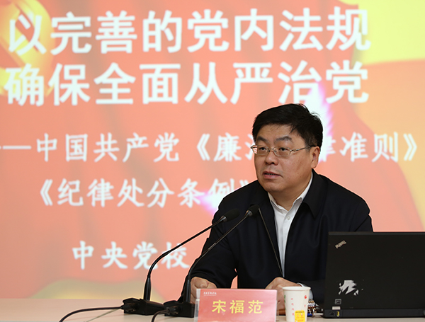 宋福范教授的报告题目为“以完善的党内法规确保全面从严治党”,他在报告中围绕《准则》和《条例》修订出台的意义、精神实质和对每一位党员领导干部提出的具体要求等三个方面,进行了深入浅出的解读。他谈到,《准则》坚持追求至善、上不封顶,正面倡导、重在立德,是党员和党员领导干部能够看得见、够得着的高标准;《条例》围绕党纪戒尺要求,开列“负面清单”、重在立规,划出了党组织和党员不可触碰的“底线”。 修订后的两大党规,通篇贯穿着“全面”与“从严”两个关键词,是党章相关规定在新的历史起点上的具体体现,把党的十八大以来治党管党的实践成果转化为道德和纪律要求。为新时期全面从严治党树立了道德高线和纪律底线。