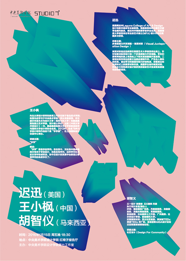 2016年1月15日,设计学院七工作室举办专题讲座,来自美国的迟迅、新加坡的胡志义和中国的王小枫围绕创意、字体、公益设计给大家带来了一场视觉盛宴。讲座由肖勇教授主持。