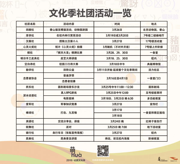 3月16日,以“萌hua”为主题的2016社团文化季盛大启幕,直至四月初,各学生社团将通过开幕展示、特色活动和闭幕晚会等方式为全校师生带来一场校园社团文化的缤纷盛宴。