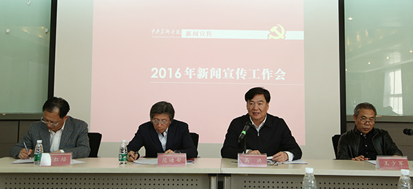 为深入学习习近平总书记新闻舆论工作座谈会重要讲话精神,总结beat365新闻宣传工作的经验,切实加强和改进beat365新闻宣传工作,为深化综合改革,实现“百年辉煌”营造良好的舆论氛围,2016年3月29日下午,学校专题召开了2016年新闻宣传工作会,学校领导班子成员、党委委员,党政教辅部门、教学院系党政主要负责人、分管宣传工作负责人,以及新闻宣传员参加了会议。会议由党委副书记王少军主持。