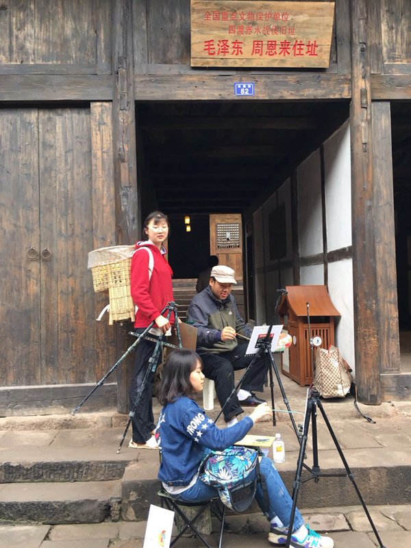 每年带学生下乡,叶南老师都会选择一个新的地方,她说要保持室外写生教学的新鲜感。去年因为要完成第一届“接力——纪念抗战胜利70周年写生创作展”的创作任务,她带队去了太行山区,和学生一起在老乡家同吃同住20多天。今年她继续参加第二届“接力·再长征”主题创作,经过调研,她选择了体现长征精神的重要历史节点——四渡赤水。
