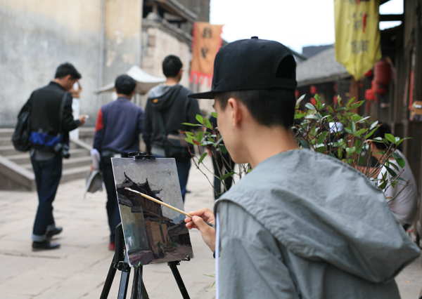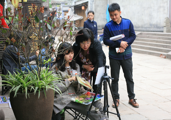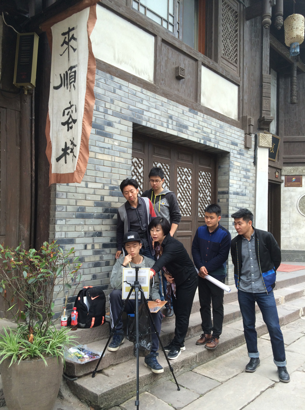 “来顺客栈”的幌子下,一位支着画架的同学正专注于古镇建筑的写生。高高低低的石板路两侧,写生的同学各自找准自己喜欢的小景安静地坐下来,这样一呆就是一天。“一定要注意光线的变化与这些古建筑的关系,注意冷暖色调,要找到你自己想表达的色彩。”叶南老师一路随时停下来指导街边写生的同学。