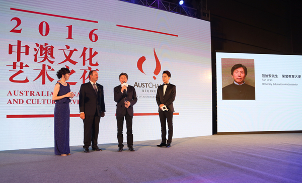 2016年5月28日晚,在北京国家会议中心举办的“2016中澳国际文化艺术之夜”现场,澳大利亚前副总理马克·维尔为我院院长范迪安颁发荣誉教育大使奖杯,并向范院长为艺术教育事业所付出的心力以及对中澳文化交流所作出的贡献表示感谢。范院长发表获奖感言,指出教育是重要的国计民生,增强艺术教育益于提升国民创造力,中澳两国在这方面有广阔的合作前景。