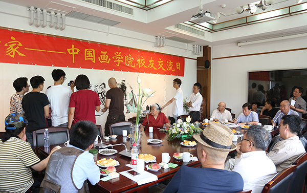 中国画学院的会议室里,校友们你一笔、我一笔,在一张大宣纸上共绘对美院、对中国画学院的未来期许;壁画系的材料工作间播放着自建系开始,壁画系师生学习、创作、生活的影像,“视频里还有我呢,那会真瘦”,“那会一起在打着乒乓球”,一幕幕带着大家又回到了那个恣意绽放的青葱岁月……