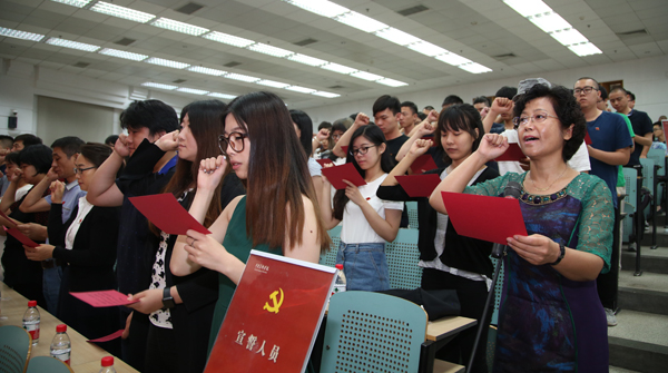 95名新党员面对党旗庄严宣誓,全体老党员重温了入党誓词。大会在雄壮的《国际歌》中结束。