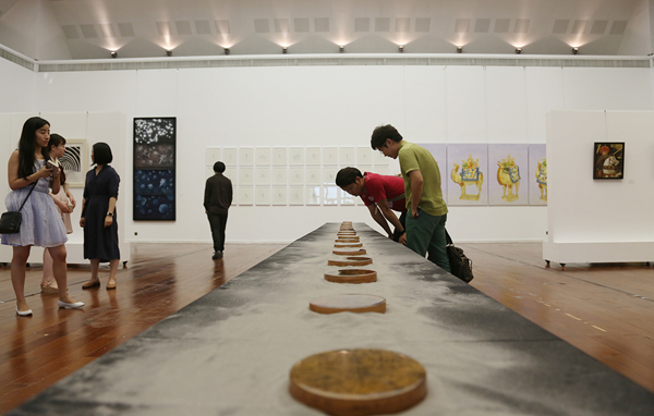 此次参展的青年艺术家既有研究生也有本科生,展览中学子们运用不同媒介材料,不拘泥于同一画种,对于东方与西方艺术的融合都有着自己独到的想法,每组作品都很严谨又十分耐看。而这样的现场气息也归功于武艺与工作室一直在探索追求的,一种自由多元的教学理念。从壁画系走出的学子们常常戏称说,壁画系应该称之为“自由艺术系”,艺术在此仿佛也没有了边界,可以自由地进行表达。正如本次展览中武艺让学生们自选作品,希望他们都拥有想象力的翅膀,发挥出自如独特的状态。武艺强调,“创作、展览、出版、收藏”对于艺术家而言是四个不可分割的整体。作品从工作室进入艺术馆,再到公众视野,在这里学生完成了像艺术家一样去思考创作的过程,这是艺术探索中尤为重要的一课。