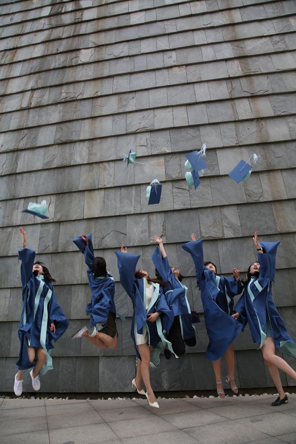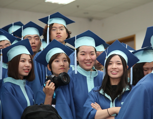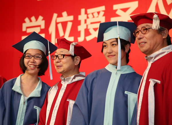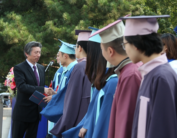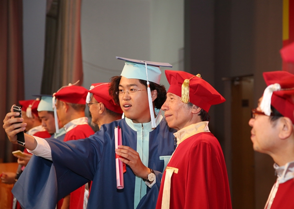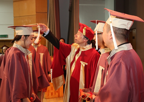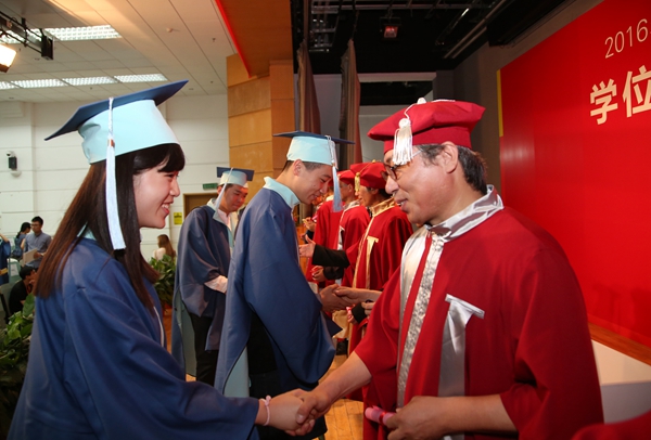 毕业典礼后,学位授予仪式在北区礼堂举行,学院领导及学位委员会委员出席仪式,为毕业生们扶正流苏。