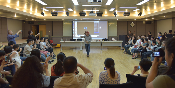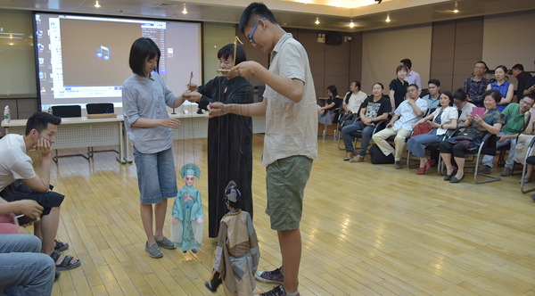 季天渊和陈全富两位传承人分别为大家表演了泰顺提线木偶戏和萍乡湘东傩舞。季天渊表演的木偶戏《贵妃醉酒》、《济公》、越剧《西湖山水还依旧》,引起了在场观众的浓厚兴趣,她指导在场的学生体验木偶戏,讲授提线木偶的表演技巧和动作,讲求表演细腻传神。陈全富为大家表演了极具江西萍乡特色的傩舞戏“将军捉小鬼”、“哪吒耍刀”,使大家对这种驱鬼逐疫、降吉纳福的傩艺术赞叹不已。