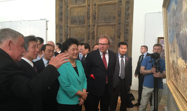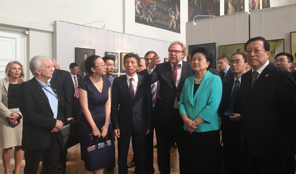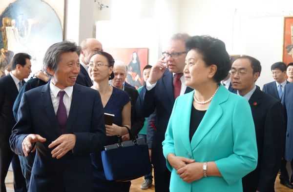 刘延东副总理在特列季亚克副部长、郝平副部长、米哈伊洛夫斯基院长和范迪安院长的陪同下观看了展览并与参展艺术家们亲切交谈,她希望两所学院在新的历史时期下,为中俄两国的文化艺术交流与合作书写新的精彩篇章。