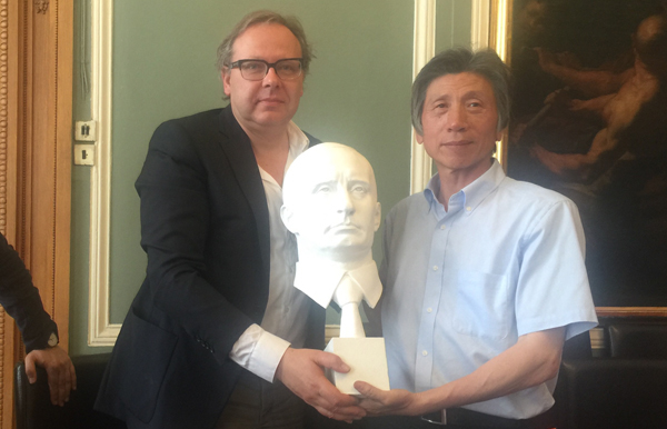 列宾美术学院院长西蒙·米哈伊洛夫斯基向范迪安院长赠送由列宾美院学生制作的普京头像