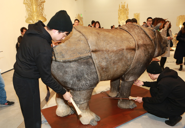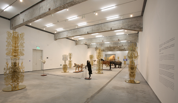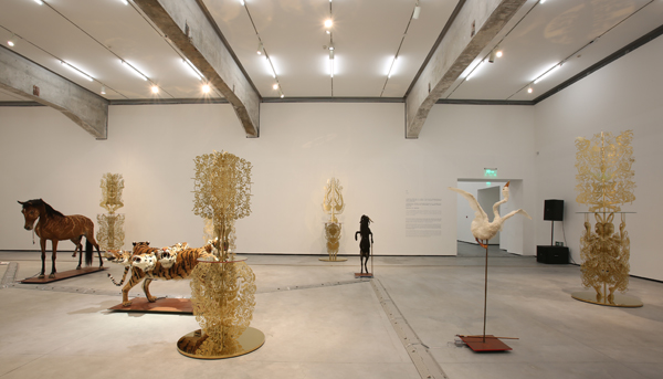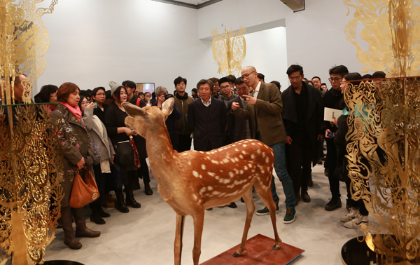 “征兆:邬建安新作展”展出了艺术家四组近40件不同形态与媒介的艺术作品:从历时4年所作的“标志性”的大型彩色剪纸拼贴作品《大河的诞生》,到从内容上与剪纸作品发生互文关系的装置作品《三王冢》;从运用黄铜镂刻的语言对10年前的作品进行“再创造”的《<白日梦>的树林》,再到最新的“跨界”艺术实验——由9件仿真动物标本组成的互动声音装置艺术作品《征兆》。作品的主题在中国文化和艺术中都有着数千年的历史根源:这里有“与天地争神”的无头巨人刑天,有《山海经》中身发异声的奇形动物,有“眉间尺”传说的惨烈结局,也有由汉代“摇钱树”化出的“白日梦树林”。犹如文化的基因, 这些故事与形象在这个展览中被邬建安的当代艺术作品再次激活。展现了传统艺术语言当代化的实践成果,凸显其在当代文化语境中的独特价值和别具一格的视觉魅力。