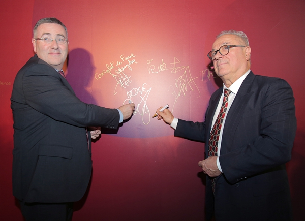法国合作院校代表KEDGE商学院院长托马·弗奥里谢(左)与法国KEDGE商学院国际发展与战略部副主任、中国区总干事居伊·马尔西亚签名留念