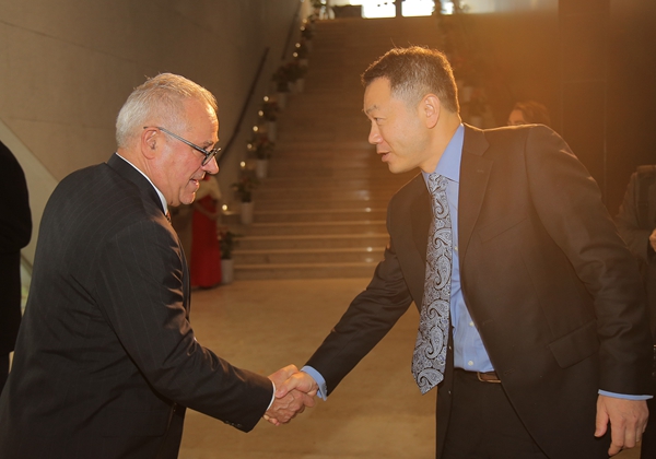 法国合作院校代表KEDGE商学院国际发展与战略部副主任、中国区总干事居伊·马尔西亚(左)上海浦东新区区委常委上海临港地区开发建设委员会党组书记、常务副主任陈杰先生(右)亲切握手交谈