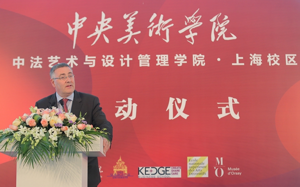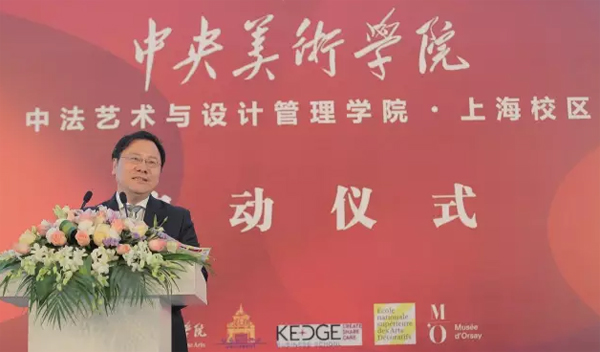 远道而来的法国合作院校代表KEDGE商学院校长托马·弗奥里谢发表了热情洋溢的启动祝词,并表示中法学院是中法两国源远流长文化之间的对话,也是艺术设计和企业管理两大领域之间的碰撞。中法双方将继续遵循合作、务实、互信的原则,将中法学院建成艺术设计与艺术管理领域里的世界顶级院校,培养更多跨学科的创新型人才,为互联网时代的社会经济变革加油助力。教育部国际交流司许涛司长在发言中表示,当前中国教育需要加强中外合作与交流,尤其是加强合作办学,引进国际一流大学的特色学科和高水平师资,充分发挥优质资源进行课程开发和科技创新。希望中法学院能够引领和示范中国高等艺术教育领域的革新,积极承担起中国高等艺术教育创新的使命和责任。上海市临港地区开发建设管理委员会党组成员、副主任吴强先生在发言中结合临港的区域优势与特色,联系临港地区的建设与发展,提出中法学院落户启动将为临港带来高水准的教育资源和文化艺术氛围。上海临港地区将全力配合中法学院落成启动后的相关工作,为学院师生提供更优质的教学环境,助力上海临港地区的艺术与文化建设,为将上海打造成为国际化人才的聚集平台发挥积极作用。