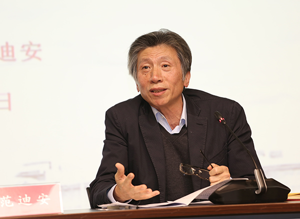 范迪安指出,习近平总书记在十次文代会上发表的重要讲话,高度肯定广大文艺工作者自党的十八大,特别是文艺工作座谈会召开两年以来,勇挑大梁、不计名利、夙夜奔忙,展现了昂扬的精神风貌、高超的艺术水平。讲话从治国理政的全局高度,更加清楚地阐述了文艺的地位、价值、使命和服务,更加具有系统性和理论性。