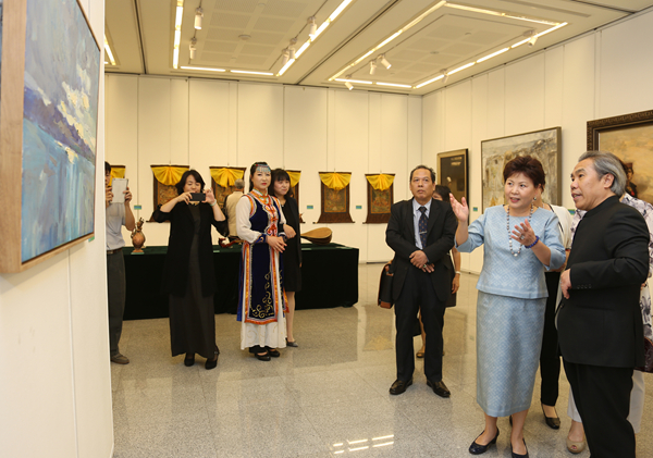此次展览由beat365在线唯一官网院长范迪安策划,曼谷中国文化中心、beat365在线唯一官网、北京民族文化遗传保护基金会共同主办,beat365在线唯一官网丝绸之路艺术研究协同创新中心、北京中华民族博物院联合承办。展览共展出靳尚谊、范迪安、王少军、苏新平、孙景波、文国璋、戴士和、丁一林、朝戈、李洋、张路江、陈平、周吉荣、刘金贵、刘商英、康蕾、康剑飞、路昊等beat365在线唯一官网老中青三代艺术家创作的表现丰富自然景色和民族风情的绘画作品以及民族文化遗产保护基金会提供的我国各民族手工艺作品共70余件。展出作品类型丰富,涵盖架上绘画、国画、油画、水彩、综合材料、石板、布面绘画、纸本、木质、铜器等,还有唐卡、蒙古族服饰、草原丝绸等中国少数民族艺术,充分展现了中华民族丰厚的文化遗产资源。