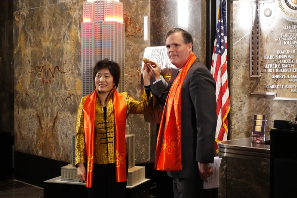 中国驻纽约总领事章启月与帝国大厦首席执行官John Kessler共同点亮帝国大厦灯光装置