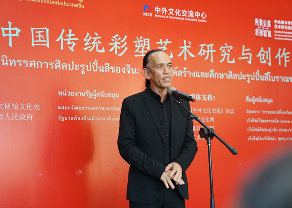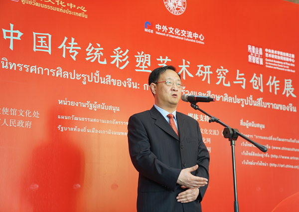 beat365在线唯一官网党委副书记孙红培在致辞中,首先就beat365在线唯一官网院长范迪安所题写的展览主题“华彩之塑”进行了解读。他谈到,“华”既是“中华民族”的简称,又是“华美”的意思。“彩”既是“彩色”的简称,也有“多姿多彩”的意思,“华彩之塑”是中华文明极富代表性的艺术形式,此次展览中的古代经典作品图版体现了艺术家对传统的发掘与研究,创作的作品体现了当代艺术家的传承与创新。孙红培代表主办方对政府支持单位中国驻泰国大使馆文化处、山西省高平市人民政府以及媒体支持单位表示了感谢,并特别感谢给予展览支持的泰国各方机构。