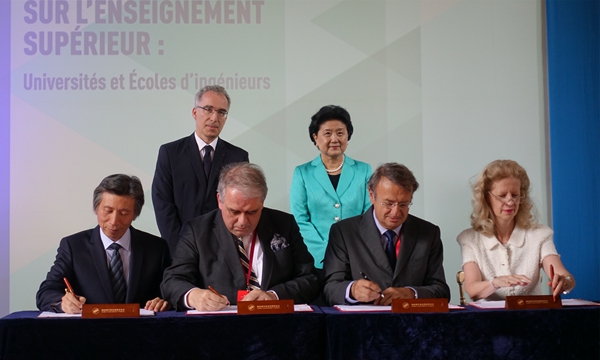 2016年6月,中国国务院副总理刘延东(右后)与法国教育部官员(左后)在法国巴黎笛卡尔大学见证中法四校签订《beat365在线唯一官网中法艺术与设计管理学院合作协议》