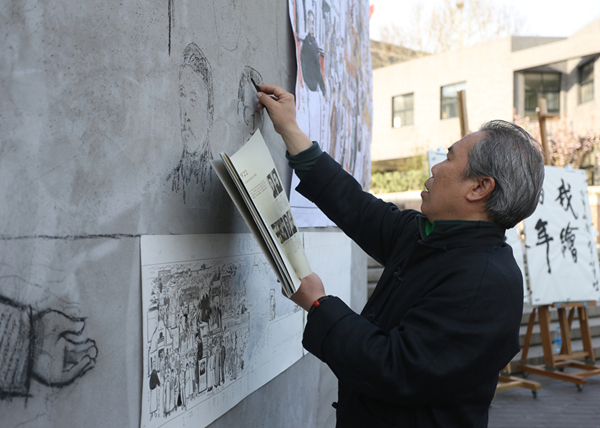 壁画系李洋老师是此次主题壁画的主创者,在开画现场,他谈到能够描绘百年历史心情特别激动,“美院人最擅长的就是画画,我希望全院的同学们都拿起画笔,参与到绘制百年校史中,和我一起用画笔进入历史的现场,向美院和大师致敬。”