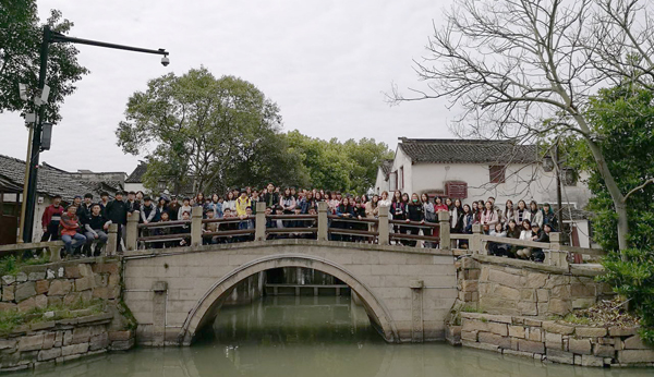 行程开始,美院众人于早晨踏在了同里老街的石板路上。起初好像与苏州其他的地方没什么不同。黛色的瓦与青苔,白色的墙与斑驳痕迹,夹杂着杨柳与繁花,是司空见惯的苏州美景。但随着小河道向前走去,不知不觉间两岸的房屋越发紧密,一切渐渐从安静变成了热闹与繁华。河道上起初是零星一两艘小船,后来是小舟整齐划一地拴成几行。有细长狭窄的小道,也有宽阔的大道,林林总总的是商铺与酒家,好不热闹。