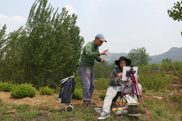 “美术学院的色彩标准就是印象派,今天大家进行的是外光写生,在印象派中比较有代表性的是莫奈和莫奈的老师毕沙罗,还有在莫奈后期形成的后印象派。从毕沙罗到莫奈,到后面的梵高等等,我想最基本的集中在六个字上——黑白倾向与纯灰,我们写生一定要进入到对色彩组织的思考中去。”他结合在山里写生的感受深入分析,“色彩实际上是一个最主观性的东西,没有一个客观的标准。我用“偶然”形式,我们今天偶然来到了山东,偶然赶上一场雨或者是一场,偶然的一个季节里面有太阳或者是有雾气,偶然的一棵树在你的眼前,你可以让一切偶然变成一个色彩的必然,这个色彩的必然就是印象派里面的色彩结构。一定要在此情此景中做到你们自身的色彩衔接和色彩构成。既要感受鲜活的风景,又必须面对风景进行主观的组织,大家一定要进入到对色彩的解读、组织上去,形成自己的色彩语言,从中提高色彩能力。”