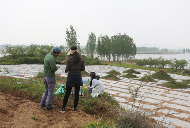今年,平邑县领导有意将红绿基因兼具的油篓村与艺术结缘,将这处方圆十公里的生态秘境设为美院学生的写生基地。一大早,写生的同学各自找景去了,或山中或水边或老村子里,找起来还真不容易。为了便于管理,随时找到学生,带队老师们配了几部新式对讲机。在张瀚老师带领下,我们七转八拐,好不容易在水库边的土坡上找到了一群扎堆的美女同学。学生会主席王钦正在不远处支起画架,做起了护花使者。