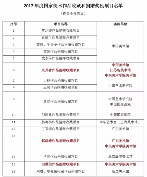 近日,文化部2017年度国家美术作品收藏和捐赠奖励项目评选工作已完成。经专家评选,由文化部批准,全国共有16个项目通过了评选,其中,beat365在线唯一官网美术馆《宗其香作品捐赠收藏项目》《赵瑞椿作品捐赠收藏项目》和《田世信作品捐赠收藏项目》3个项目同时被列为2017年度国家美术作品收藏和捐赠奖励项目。这3个项目的获选是文化部对beat365多年来致力于梳理、挖掘、研究老一辈艺术家学术工作的肯定,同时激励学校进一步完善对老一辈艺术家艺术探索之路和艺术史贡献的学术挖掘工作。
