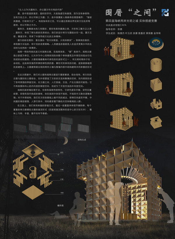 在此次搭建大赛中,我院代表队提交的作品“围厝之间”获得了评委的一致好评。“围厝之间”设计理念源于对福建土楼和闽南古厝的抽象解读。结合3x3米的搭建场地,通过拓扑变形将方形的古厝与圆形的土楼浓缩在一起,外方的墙上充满大小空洞,大洞可穿,中洞可坐,小洞可望,塑造了与外部环境多样化的联系方式,而内圆的墙半高半低,半围半敞,形成了具有多样性的思考冥想停留空间。在方圆“之间”,在开敞与封闭“之间”,在穿越与停留“之间”,孕育了无限的可能性。传统的“围厝”经过我们的重新演绎,不再是封闭向心的内向型防御居住空间,而成为了开放辐射的外向交流空间。