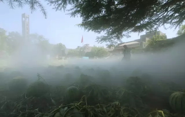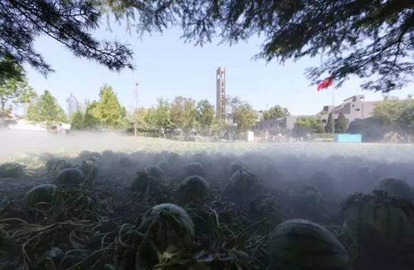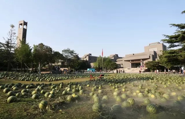 清晨的阳光,暖暖地撒入校园中心广场,原有的草坪上长出一片西瓜田,带着露珠的新秧,圆溜溜的西瓜,在晨曦中呈现一派夏日丰收盛景。