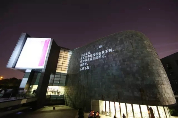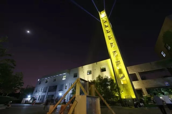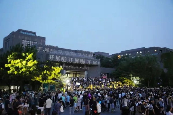 “开展啦!开展啦!来看毕业展啦”晚八点,10位同学手持喇叭、骑着小黄车穿梭在人群中。伴随着暮色,校园里华灯初上,五彩灯束点亮了校园,校史馆、美术馆、5号楼墙外,激光字幕也打出了“开展啦”字样, 2017本科毕业作品展在欢乐的气氛中如约开启。