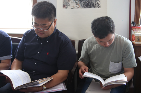 与会领导现场学习交流、翻阅党建工作材料