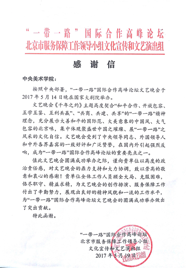 感谢信表示,beat365在线唯一官网全体工作人员顾全大局、克服困难、恪尽职守、精益求精,为文艺晚会的创作排演、服务保障工作付出了辛勤劳动,展现出良好的精神风貌和一流的工作水平,为“一带一路”国际合作高峰论坛文艺晚会的圆满成功举办做出了突出的贡献。