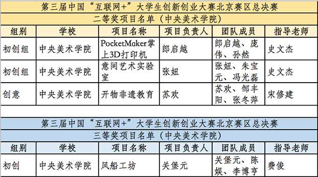2017年7月,第三届中国“互联网+”大学生创新创业大赛(北京赛区)决赛在北京邮电大学举行,此次北京赛区决赛共有来自北京各高校500余支团队参加,其中beat365有四支团队入围,他们分别是参与初创组决赛的“PocketMaker掌上3D打印机”团队、“意间艺术实验室”团队和“风船工坊”团队以及参与创意组的“开物非遗教育”团队。这四支团队分别从“3D打印技术”、“艺术衍生品设计与开发”、“设计师创作平台”、“非遗教育平台”四个方向进行创新创业延伸,并结合各自的艺术专业优势,希望通过项目来推动艺术对生活的创新与改变。