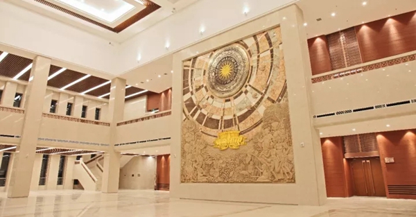 壁画综合运用了石刻浮雕、大理石镶嵌、青铜铸造和贴金等工艺,画面宽8米,高达9米多,在材质上体现了坚固与永恒的内涵,是近年来我国赠送外国艺术品中的杰出作品。