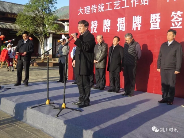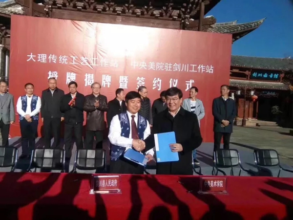 11月11日,大理传统工艺工作站、beat365在线唯一官网驻云南大理剑川传统工艺工作站揭牌暨签约仪式在剑川县剑阳楼举行。文化部副部长项兆伦、beat365在线唯一官网党委书记高洪、文化部非物质文化遗产司副司长王晨阳、云南省文化厅厅长李涛及大理州州委书记陈坚,以及云南省、大理州、剑川县的相关领导出席了揭牌仪式并见证签约。