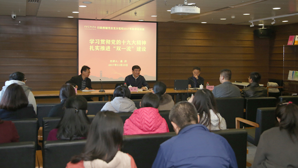 2017年11月10日,行政教辅部门联合党总支分党校2017年秋季培训班邀请党委书记高洪做“学习贯彻十九大精神,扎实推进‘双一流’建设”专题辅导讲座。各行政教辅党支部委员、分党校全体学员,以及部分青年教师一同聆听讲座。