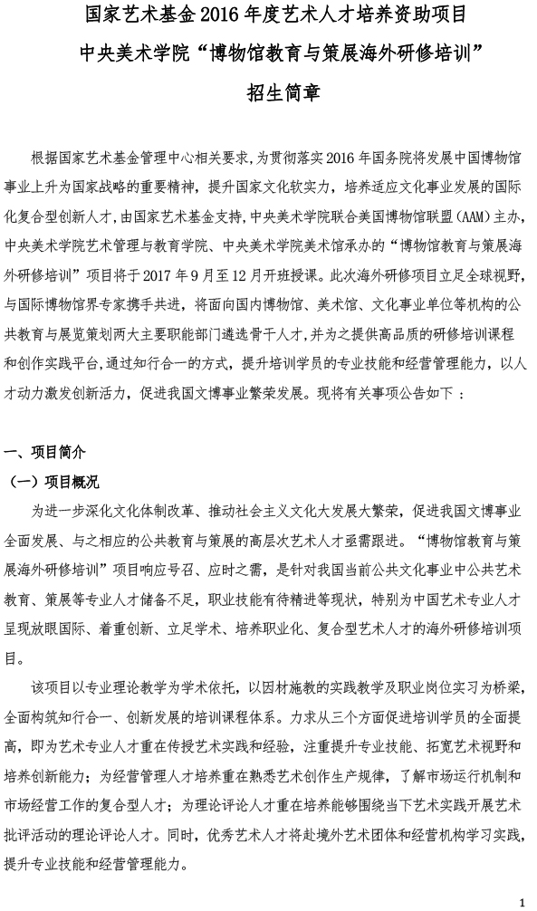 国家艺术基金2016年度艺术人才培养资助项目:beat365在线唯一官网“博物馆教育与策展海外研修培训”招生简章